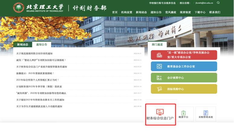 (一)登陸計(jì)劃財(cái)務(wù)部“財(cái)務(wù)綜合信息門戶”(校園網(wǎng)登陸網(wǎng)址:http://jhcwb.bit.edu.cn;非校園網(wǎng)登陸網(wǎng)址:https://webvpn.bit.edu.cn,登陸后選擇計(jì)劃財(cái)務(wù)部-主頁(yè)。)