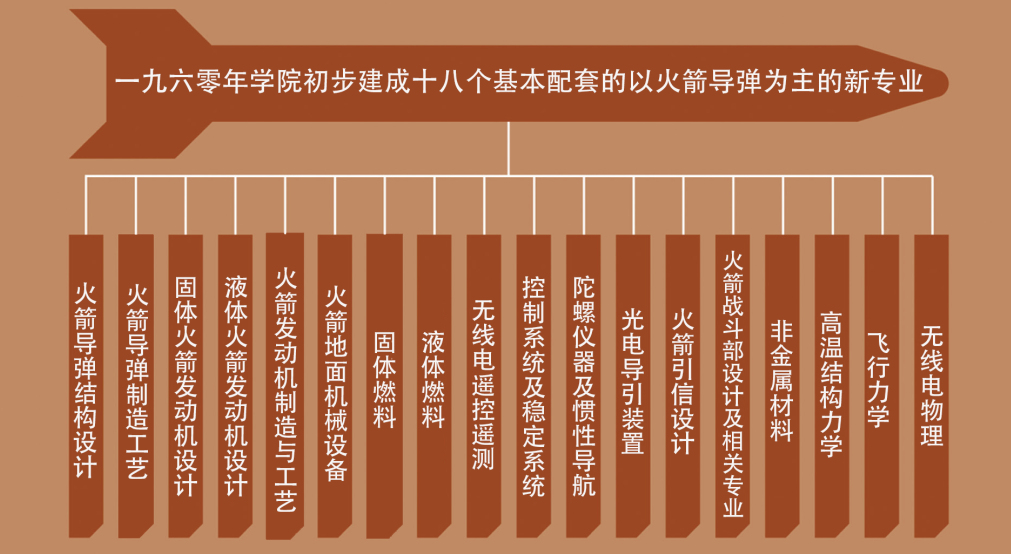 從1958年建立新中國第一批火箭導(dǎo)彈專業(yè),到1960年初步建成18個以火箭為主的新專業(yè)和若干研究所,北京工業(yè)學(xué)院形成了完整的火箭系統(tǒng)教學(xué)科研體系。