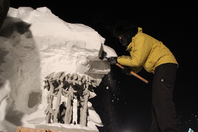 第二天進(jìn)行的工作是基礎(chǔ)造型,對作品中的竹葉、小鳥等細(xì)部進(jìn)行雕刻,在塑形過程中發(fā)現(xiàn)不合理的地方,同學(xué)們還要隨時(shí)修改、隨時(shí)調(diào)整。制作雪雕的過程是一個(gè)做減法的過程,因此塑形的過程面臨著各種困難,其中最大的困難是注意力必須要非常集中,絕不能有絲毫差錯(cuò),若雪塊一旦雕錯(cuò),就無法重新再來。在初期雕刻竹葉時(shí),同學(xué)們估算錯(cuò)了葉子的承受能力,竹葉出現(xiàn)了斷折的情況,而唯一的補(bǔ)救方法就是在原有基礎(chǔ)上縮小竹葉的盡寸重新雕刻。精雕細(xì)刻見匠心,長達(dá)十多小時(shí)的連續(xù)工作中,同學(xué)們戴了兩層手套的手凍到?jīng)]有知覺,手套一次次地濕透又一次次被寒風(fēng)吹干。雕磨到一半時(shí),同學(xué)們發(fā)現(xiàn)手中的工具開始變鈍,這時(shí)隊(duì)員李雨璇和蔣亦希兩位女生自告奮勇地表示要前去找磨刀鋪將工具打磨鋒利。這是哈爾濱四點(diǎn)半的天空,但仿佛已像是深夜,在人生地不熟的異鄉(xiāng),兩位女生扛著沉重的鐵器開始四處尋找磨刀鋪。三個(gè)小時(shí)后,她們終于成功將磨利的刀子交到同伴們的手上。垂垂夜幕,陰霾天空,同學(xué)們還在馬不停蹄地趕工,事實(shí)上雪雕制作中的很多工作是只能在晚上進(jìn)行,夜晚時(shí)雪的粘度會(huì)因?yàn)闇囟冉档投龃螅@為雪雕細(xì)節(jié)的修改和塑性創(chuàng)造了有利的條件。可是晚上的氣溫特別低,同學(xué)們往往工作一會(huì)兒就凍得渾身發(fā)抖,只能靠照明燈泡發(fā)出的熱量取暖、烘烤手套。夜晚回到宿舍,大部分同學(xué)累得倒頭就睡,這時(shí)隊(duì)長周谷川悄悄地拿起熱水瓶下樓為同學(xué)們打洗腳水,這一幕被細(xì)心的李曉龍看到了。第二天當(dāng)李曉龍想起幫助同伴們打水時(shí),發(fā)現(xiàn)暖瓶已經(jīng)被周谷川搶先拎走了。事實(shí)上,這種“我為人人,人人為我”的事情每天都在發(fā)生,參賽的每個(gè)同學(xué)都看在眼里,感動(dòng)在心里。