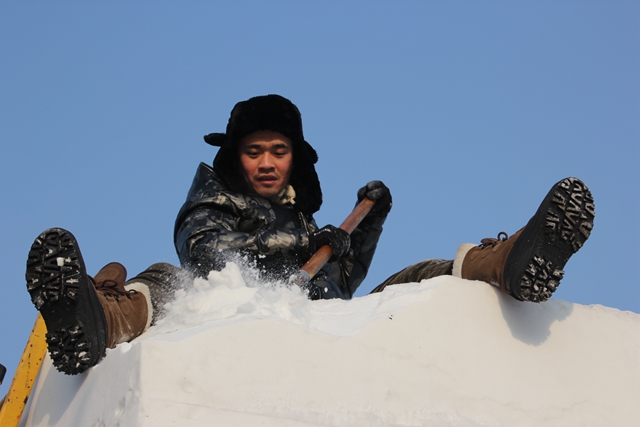 第一天的工作是“出大型”,出大型可是力氣活,面對高達(dá)三米的雪方,同學(xué)們需要用腳手架、梯子、平刀、叉子等工具讓雪方呈現(xiàn)了一個(gè)初步的雛形。表面上“出大型”的工作是個(gè)力氣活兒,事實(shí)上其中的精妙只有從事過雪雕制作的人才能體會(huì)——“出大型”工作往往存在各種悖論,如果不用力,效率就比較低;如果太用力,往往就會(huì)打亂原先的框架。雖然天氣寒冷,但是同學(xué)們怕穿著太厚行動(dòng)不便影響工作效率,只能穿著基礎(chǔ)的御寒衣服在冰天雪地里工作。為了感覺不那么冷,同學(xué)們一刻不停地鏟著雪,用勞動(dòng)的熱浪驅(qū)走刺骨的寒冷。
