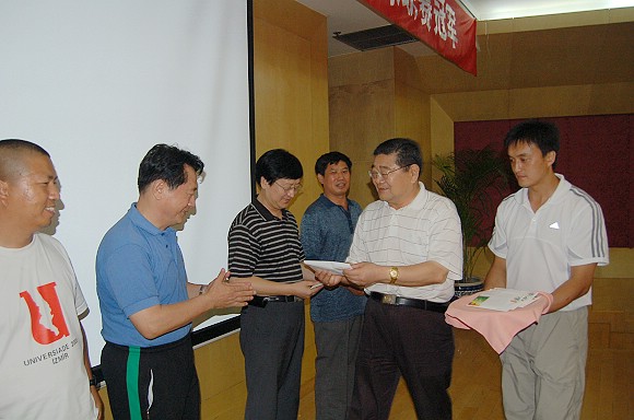 黨委書記焦文俊在向教練員、運動員代表頒發獎金。