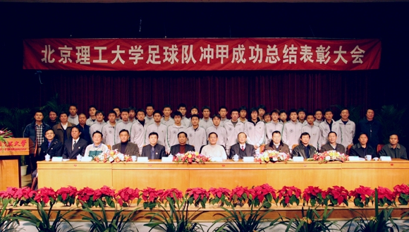 表彰大會上,學校體育部主任劉啟孝匯報了足球隊近年來所取得的成績。北京理工大學足球隊自2000年成立以來,四次榮獲全國大學生足球聯賽冠軍,代表中國出征世界大學生運動會,取得第七名的好成績。今年,在全國足球乙級聯賽中脫穎而出,榮膺桂冠,成為第一支成功沖入全國足球甲級聯賽的“學生軍”。 這一成就引起了社會的廣泛關注,在社會上樹立了學校和當代大學生的良好形象。
