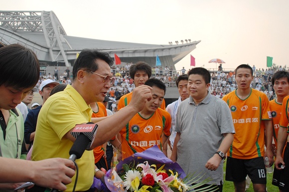 比賽一結束,球隊的冠名贊助商暨戰略合作伙伴——愛國者的總裁馮軍先生就興奮地跑向隊員中,代表華旗的1900人向金指導獻花,并向金指導和學生軍們表示了熱烈的祝賀。值得一提的是今天是馮軍先生的生日,在這個重要而特殊的日子,他攜親友和華旗的員工一起來為愛國者大學生隊加油助威,馮軍先生說今天隊員們的優異表現是他收到的最好的生日禮物。愛國者大學生隊頑強拼搏,不畏強敵,堅持到最后一分鐘,永不言敗,永不服輸。這正與愛國者的企業信念是一脈相承的。作為學生軍的冠名方和戰略合作伙伴愛國者,在中甲開賽以來的每場比賽中都給予了學生們極大的安慰和鼓勵。無論是主場還是客場,他們都組織了強有力的助威陣容,為場上的隊員們搖旗吶喊,無論輸贏,他們都是那樣熱烈地鼓舞著他們的球隊,為他們加油。他們說,因為我們是一個大團隊,我們要相互支持和鼓勵。