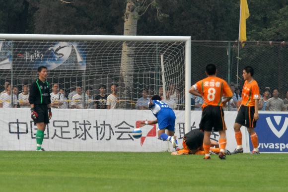 也許是輕敵的緣故,廣州醫藥隊一上來踢得有些漫不經心。而學生軍面對勁敵絲毫沒有放棄,大家都鼓足了勁奮力一搏。比賽前20分鐘雙方各有破門機會,廣藥并沒能在學生軍身上占到便宜。相反,愛國者大學生隊頻頻通過反擊威脅廣藥的防線,第26分鐘,韓國留學生金俊植左路帶球狂奔10余米后大力抽射,球稍微高出廣藥大門。第29分鐘,愛國者大學生隊隊長袁微被廣州醫藥外援撞傷,一分鐘后他再次被踢中,受傷不輕,被擔架抬出場外后才再次回到場上。