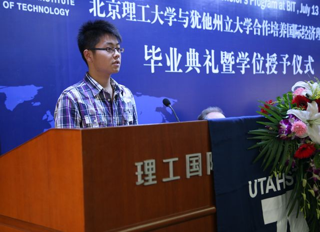 李璐同學代表全體畢業生發言,她用充滿激情的語言對北京理工大學和猶他州立大學的悉心培養表達了感謝和感恩之情。