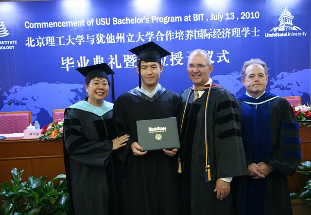 2010年7月13日下午,北京理工大學與美國猶他州立大學合作培養理學士項目第四屆學生畢業典禮在北理工國際教育交流中心報告廳隆重舉行。出席畢業典禮的有猶他州立大學商學院常務副院長Dr .Chris Fawson,國際合作教育處主任Li Li博士、、商學院經濟與金融系主任Dr. Tyler Bowles, 北京理工大學趙長祿副校長、國際交流合作處汪瑩副處長、國際教育合作學院梅文博院長和劉世奇副書記。國際教育合作學院部分教職工、全體畢業生及部分學生家長一起參加了畢業典禮。典禮由國際教育合作學院梅文博院長主持。