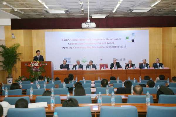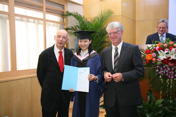 2012年9月7日下午,在我校國際教育交流大廈三層報(bào)告廳隆重舉行我校與德國康斯坦斯應(yīng)用科學(xué)大學(xué)合作為國際著名奔馳汽車生產(chǎn)商戴姆勒公司舉辦的EMBA項(xiàng)目第四期畢業(yè)典禮暨第六期新生開學(xué)典禮。出席典禮的嘉賓有:北京理工大學(xué)副校長孫逢春教授、戴姆勒東北亞地區(qū)首席財(cái)務(wù)官Helmut Ruhl先生、戴姆勒東北亞投資有限公司執(zhí)行副總裁Matthias Zeuch先生、因戈?duì)査顾貞?yīng)用科學(xué)大學(xué)Thomas Doyé教授、康斯坦斯應(yīng)用科學(xué)大學(xué)Josef Wieland教授、康斯坦斯應(yīng)用科學(xué)大學(xué)繼續(xù)教育部部長Roland Luxemburger先生、我校國際教育合作處王慶林處長、國際教育合作學(xué)院梅文博院長、羅佳書記、第四期全體學(xué)員和第六期新學(xué)員。典禮由梅文博教授主持。