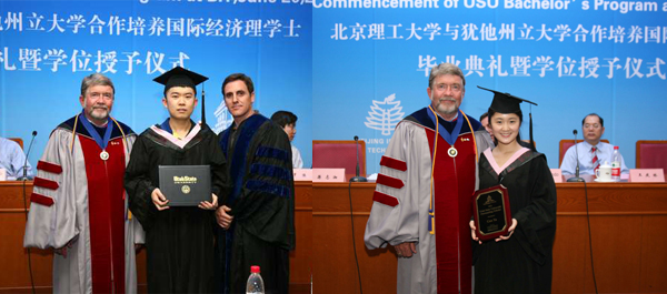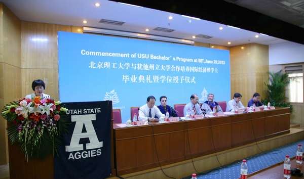 2013年6月20日下午,國(guó)際教育合作學(xué)院在理工國(guó)際教育交流大廈報(bào)告廳隆重舉行了北京理工大學(xué)與猶他州立大學(xué)合作辦學(xué)項(xiàng)目第七屆學(xué)生畢業(yè)典禮。出席畢業(yè)典禮的有猶他州立大學(xué)Jon Hunstman商學(xué)院副院長(zhǎng)Frank Caliendo博士、中國(guó)項(xiàng)目主任Dwight Israelsen博士,北京理工大學(xué)國(guó)際交流合作處處長(zhǎng)王慶林教授、國(guó)際教育合作學(xué)院院長(zhǎng)梅文博教授、羅佳書記、明道福副院長(zhǎng)、蔣志湘副院長(zhǎng)、學(xué)院部分教職工、全體畢業(yè)生、部分學(xué)生家長(zhǎng)以及猶他州立大學(xué)來京訪學(xué)的學(xué)生代表團(tuán)。典禮由蔣志湘副院長(zhǎng)主持。