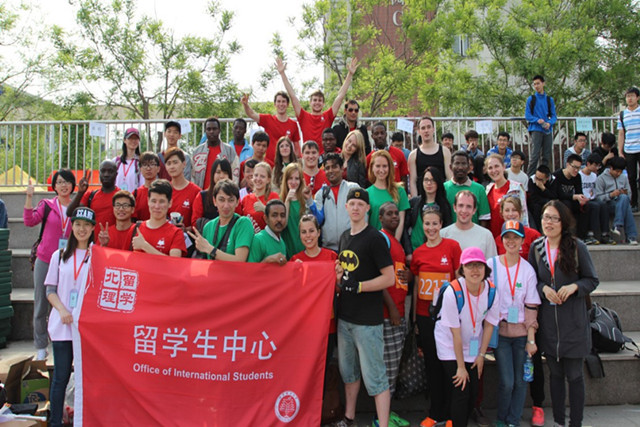 就像奧運會的入場式一樣,留學生中心也有自己的隊伍,來自白俄羅斯的阿蓮娜擔任先導員,北京理工大學第38屆深秋歌會總決賽冠軍、來自津巴布韋的趙勝利擔任旗手。師生們放松又愜意,隨性又張揚,無論如何也掩飾不住內心的雀躍和歡騰。讓人沒想到的是,站在跑道一側的拉拉隊員,看到留學生們后似乎比留學生們還要興奮和快樂,這也許是因為留學生作為一個方陣第一次在綠茵場上亮相,第一次如此高調的出現在北理工師生們的視野中的緣故,所以才引來了驚奇的目光和熱情的歡呼。