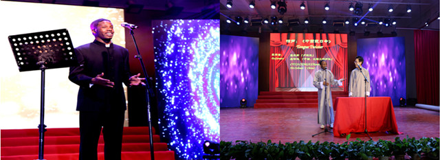 頒獎(jiǎng)典禮結(jié)束后,是外國(guó)留學(xué)生的新年聯(lián)歡會(huì)。聯(lián)歡會(huì)在60多個(gè)國(guó)家學(xué)生表演的舞臺(tái)秀中拉開(kāi)序幕,“高音王子”趙勝利的《費(fèi)加羅的婚禮》選曲和《那就是我》將晚會(huì)推向了第一個(gè)高潮;盧旺達(dá)學(xué)生查爾斯與中國(guó)學(xué)生黑澤峘的相聲《中西繞口令》,展現(xiàn)了我校留學(xué)生高超的漢語(yǔ)水平;來(lái)自尼日利亞的學(xué)生表演了他們的民族舞蹈,他們是我校第一批孔子學(xué)院獎(jiǎng)學(xué)金生,平時(shí)表現(xiàn)非常突出;韓國(guó)和尼日利亞雙人組合帶來(lái)的情歌對(duì)唱《愛(ài)你》,清新動(dòng)人。聯(lián)歡會(huì)還邀請(qǐng)了校武術(shù)隊(duì)的同學(xué)前來(lái)表演,他們的精彩對(duì)陣贏來(lái)同學(xué)們的陣陣喝彩。