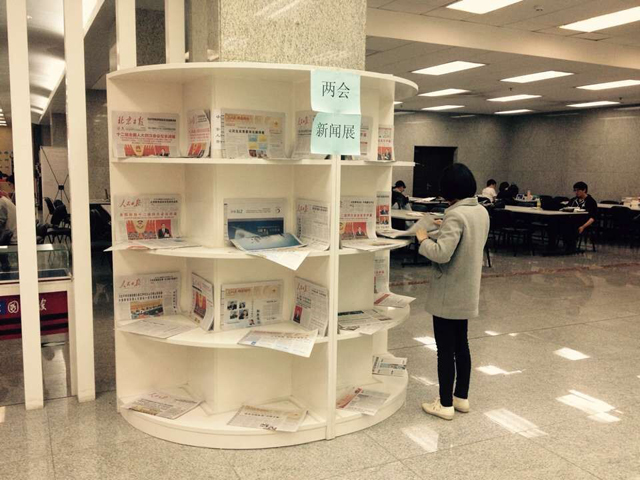 2016年是“十三五”規(guī)劃的開局之年,隨著2016年全國兩會的順利召開,為更好地學習貫徹兩會精神,圖書館以“世界讀書日”為契機,利用館內豐富的報刊資源在圖書館一層休閑區(qū),向讀者展示有關“兩會”專題的新聞報道,以使讀者更加便捷、集中地了解兩會熱點、學習兩會精神,在提高學術造詣的同時,加強精神建設,關心時事,完善自身修養(yǎng)。