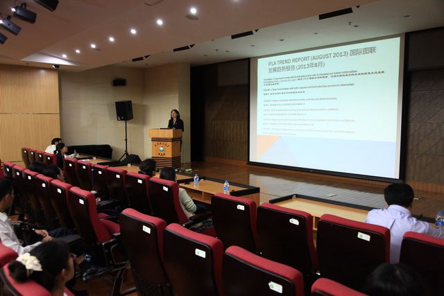 阮煉博士做了題為《美國學(xué)術(shù)圖書館的發(fā)展和未來趨勢》的報(bào)告,介紹了伊利諾伊大學(xué)香檳厄巴納分校中國圖書館員暑期項(xiàng)目開展情況及效果,并就中美圖書館間國際合作項(xiàng)目的實(shí)施和開展進(jìn)行交流。