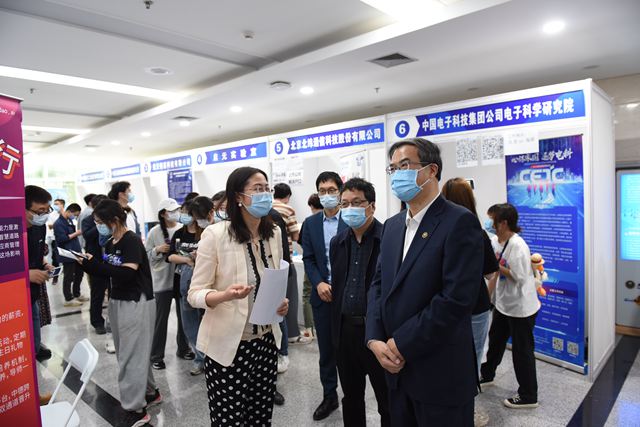 招聘會現場,校黨委書記張軍院士、副校長龐思平帶隊,與參會單位進行親切交流,介紹學校人才培養優勢和專業特色,了解單位吸納北理工學生就業實習情況和春招工作進展,并與在場學生進行溝通,詢問求職意向及應聘情況。