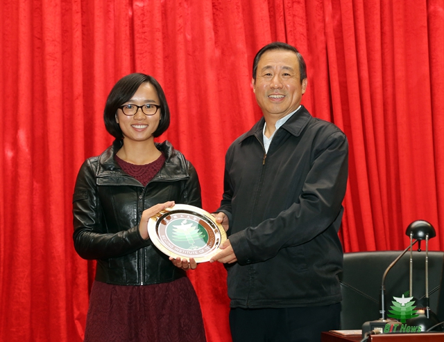 學生代表向許達哲贈送了北京理工大學校徽。