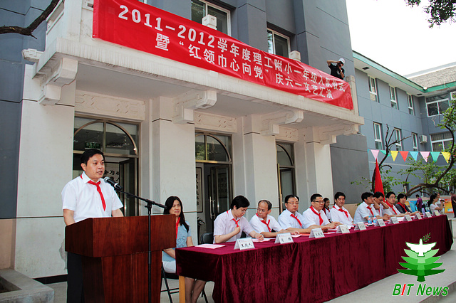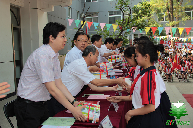 5月31日上午,在理工附屬小學少先隊一年級入隊儀式上,胡海巖校長、趙顯利副校長與學校辦公室黨支部黨員代表親手將精心挑選的一百本優質題材圖書交到了少先隊員代表手中,并鼓勵他們好好學習,努力成才。附小的少先隊員代表為他們戴上了鮮艷的紅領巾,表達了由衷的感謝和崇高的敬意。