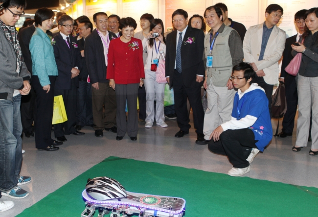 2011年10月22日上午十時,本次全國大學(xué)生創(chuàng)新年會參賽作品競賽正式開始,賽場氣氛即緊張又熱烈,各校選送的參賽作品科技含量高、專業(yè)覆蓋廣,充分反映了各參賽高校大學(xué)生課外創(chuàng)新活動的最高水平和最強(qiáng)實(shí)力。我校兩項(xiàng)參展作品憑借先進(jìn)的理念、創(chuàng)新的構(gòu)思、優(yōu)異的表現(xiàn),在眾多參展作品中脫穎而出,成為閃爍的明星。尤其是“新型節(jié)肢機(jī)器人”,其豐富的行進(jìn)步態(tài)、精彩的運(yùn)動效果、可靠的控制性能、超群的演示功能,使之成為競賽現(xiàn)場的“強(qiáng)中強(qiáng)”和“王中王”。教育部部長助理林蕙青、科技部政策法規(guī)司副司長王宇等領(lǐng)導(dǎo)一到比賽現(xiàn)場,首先就來到我校展位觀看新型節(jié)肢機(jī)器人的運(yùn)動展示。在饒有興致地聽取了項(xiàng)目組組長吳帆同學(xué)的細(xì)致講解并仔細(xì)觀看了機(jī)器人的全套表演后,林蕙青部長助理緊握帶隊(duì)老師兼指導(dǎo)教師羅慶生教授的手,高度評價說:“節(jié)肢機(jī)器人的表演實(shí)在太精彩了!老師辛苦了!同學(xué)們辛苦了!”