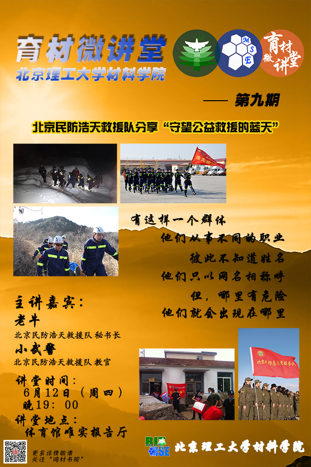 材料學(xué)院“育材微講堂”第九期預(yù)告—北京民防浩天救援隊(duì)“守望公益救援的藍(lán)天”