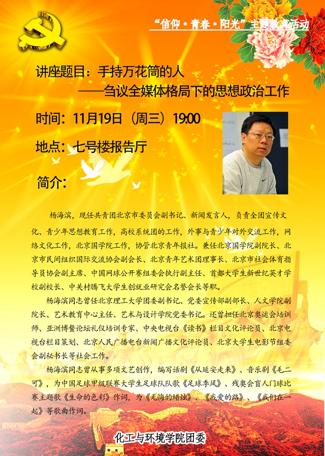 為切實引導和幫助青年學生以習近平總書記系列重要講話精神為根本遵循,自覺將社會主義核心價值觀內化于心、外化于行;鼓勵學生做有理想、有道德、有文化的社會主義公民。此次講座化工與環境學院團委有幸邀請到共青團北京市委副書記楊海濱老師為同學們做關于解讀社會主義核心價值觀的主題教育講座,歡迎廣大老師、青年同學聆聽。