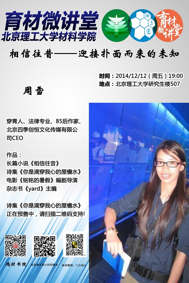?>?“育材微講堂”第十二期預告—周雪和她的《相信往昔》們