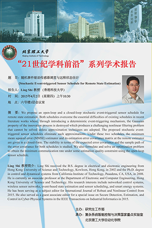 施凌教授于2002年獲得香港科技大學理學學士學位,2008年獲得美國加州理工學院哲學博士學位。現任香港科技大學電子與計算機工程系副教授。施凌教授的研究方向主要包括網絡化控制系統,無線傳感器網絡,事件驅動狀態估計與傳感器調度,智能能源系統等,在控制與信號處理領域頂級國際刊物Automatica, IEEE Transactions on Automatic Control, IEEE Transactions on Signal Processing, Systems & Control Letters上發表論文40余篇?,F擔任控制領域國際期刊International Journal of Robust and Nonlinear Control編委,并擔任IEEE Transactions on Industrial Informatics特刊Secure Detection, Estimation, and Control in Cyber-Physical Systems客座編輯。