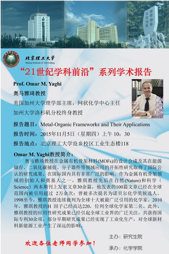 【化學學院】“21世紀學科前沿”Omar M. Yaghi教授學術報告通知