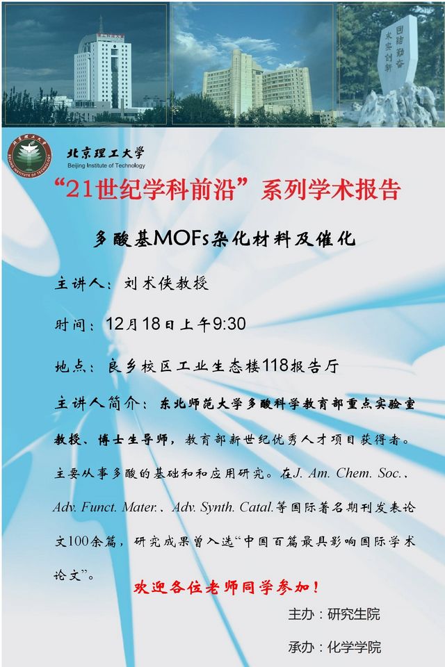 【化學學院】“21世紀學科前沿”劉術俠教授學術報告通知