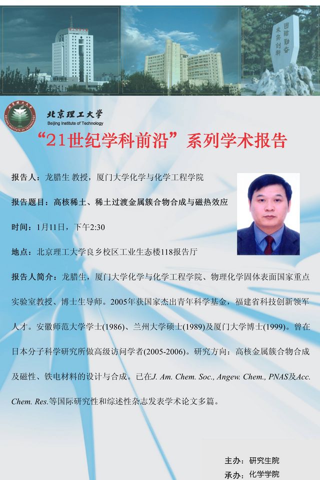 ?>?【化學學院】“21世紀學科前沿”龍臘生教授學術報告通知