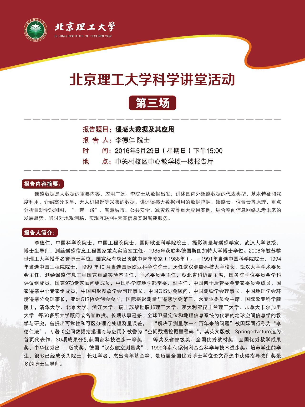 ?>?北京理工大學科學講堂活動通知——李德仁院士遙感大數據及其應用學術報告