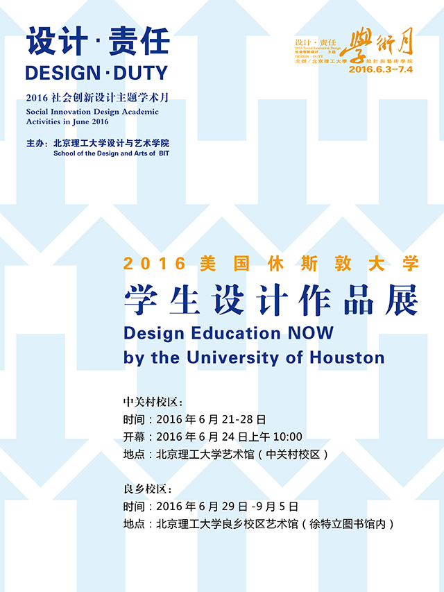 2016“設計·責任”主題學術月系列展覽之一,美國休斯敦大學學生設計作品展將于6月21-28日在北京理工大學藝術館(中關村校區)展出,展覽開幕式將于24日上午10:00進行。