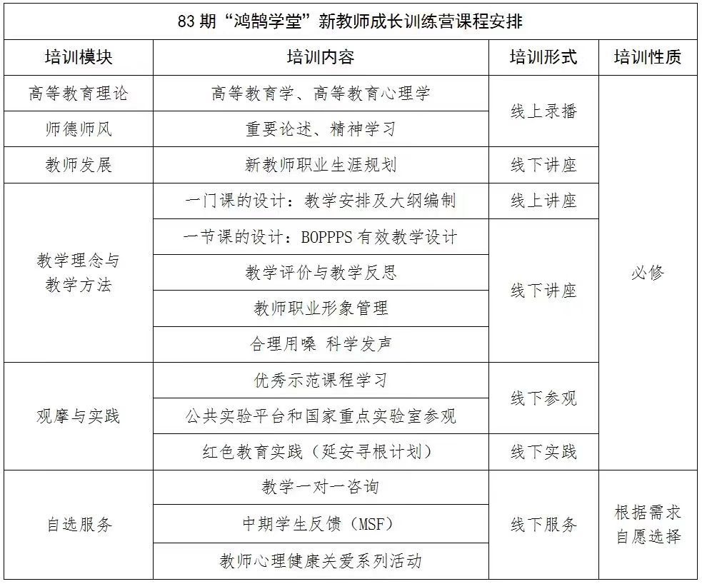 為深入貫徹《中華人民共和國教師法》和全國教育大會精神,落實學校關(guān)于加強師德師風建設(shè)、加大教師培訓力度的有關(guān)要求,根據(jù)新入職教師崗位要求,新入校教師應(yīng)在一年內(nèi)完成崗前培訓全部課程,通過考核后獲得《北京理工大學教師崗前培訓合格證書》。我?,F(xiàn)開展第83期“鴻鵠學堂”新教師成長訓練營,并將培訓有關(guān)事項通知如下: