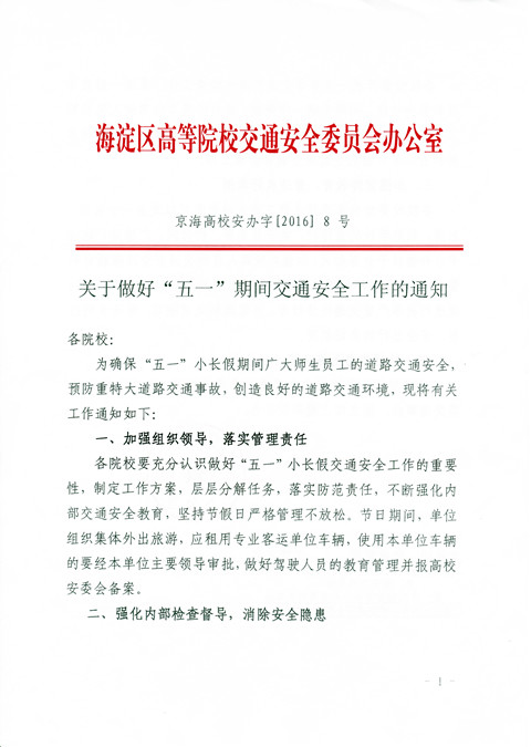 根據海淀區高等院校交通安全委員會辦公室《關于做好“五一”期間交通安全工作的通知》(詳見附件)要求,為切實做好“五一”期間的交通安全工作,確保廣大師生員工假期的交通安全,請各學院、部、處做好以下工作: