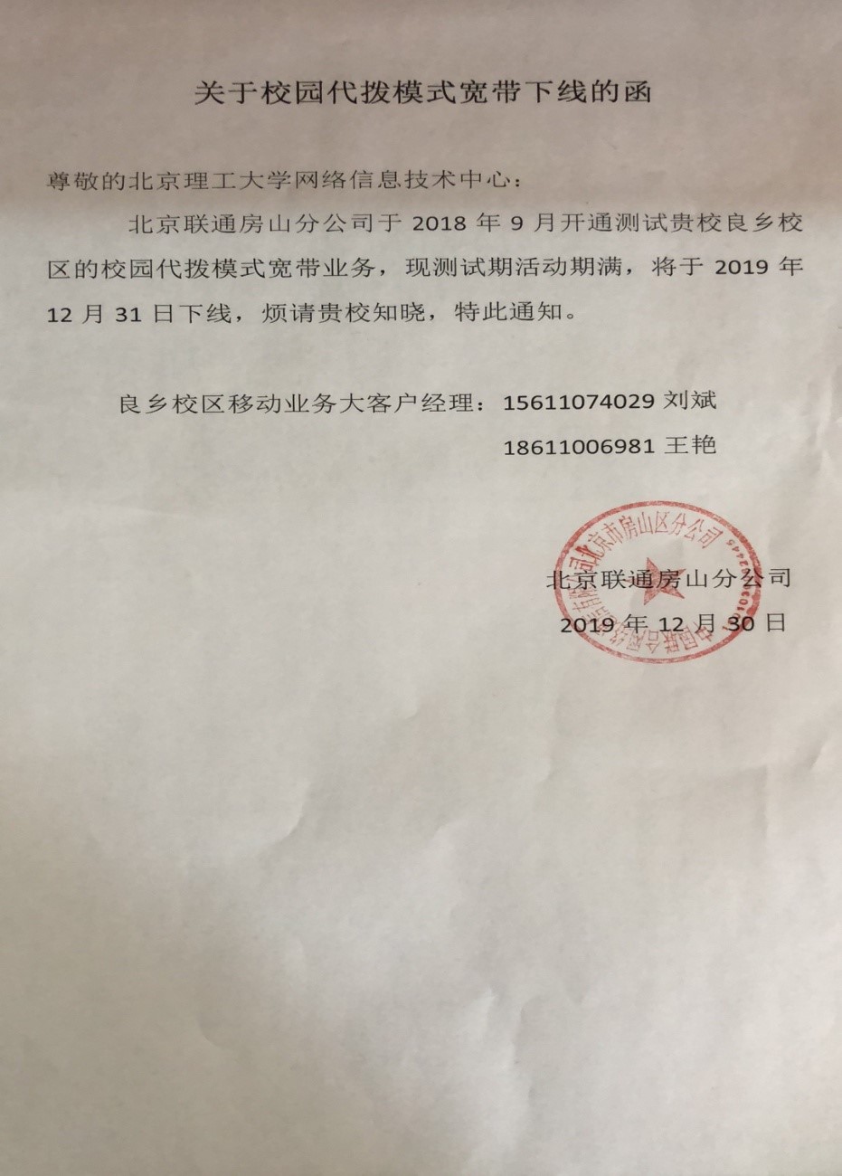 網絡信息技術中心于2018年9月與北京聯通合作開通了中關村校區和良鄉校區的學生宿舍區聯通無線寬帶業務測試,現接北京聯通方面告知,測試活動期滿,相關服務將于2019年12月31日停止服務。