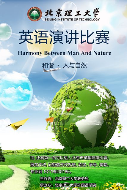 本次英語(yǔ)演講比賽由北京理工大學(xué)教務(wù)處主辦、北京理工大學(xué)外國(guó)語(yǔ)學(xué)院承辦,以“Harmony Between Man and Nature”為主題,以為北理學(xué)子提供鍛煉英語(yǔ)口語(yǔ)、展示自身風(fēng)采的平臺(tái)為宗旨。