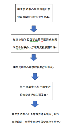 已辦理校園地國家助學貸款的同學如需繼續攻讀學位,并且畢業前不準備償還貸款,可申請辦理貸款展期,貸款展期即將現有貸款辦理延期申請,變更還款期限,在繼續攻讀學位期間貸款利息由國家補貼無需個人承擔,待繼續攻讀學位完成后開始還款。具體辦理流程如下: