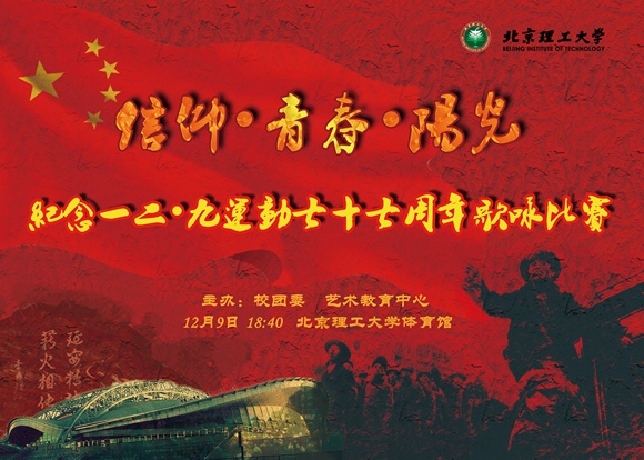 我校“紀念一二•九運動七十七周年歌詠比賽”決賽將于 2012年12月9日18:40在 中關村校區體育館舉行,包括自動化學院、管理與經濟學院等進入決賽的14個學院合唱隊將用歌聲表達對先烈的緬懷和未來的美好向往。期間我校大學生藝術團、學生社團聯合會也有精彩的節目呈現。