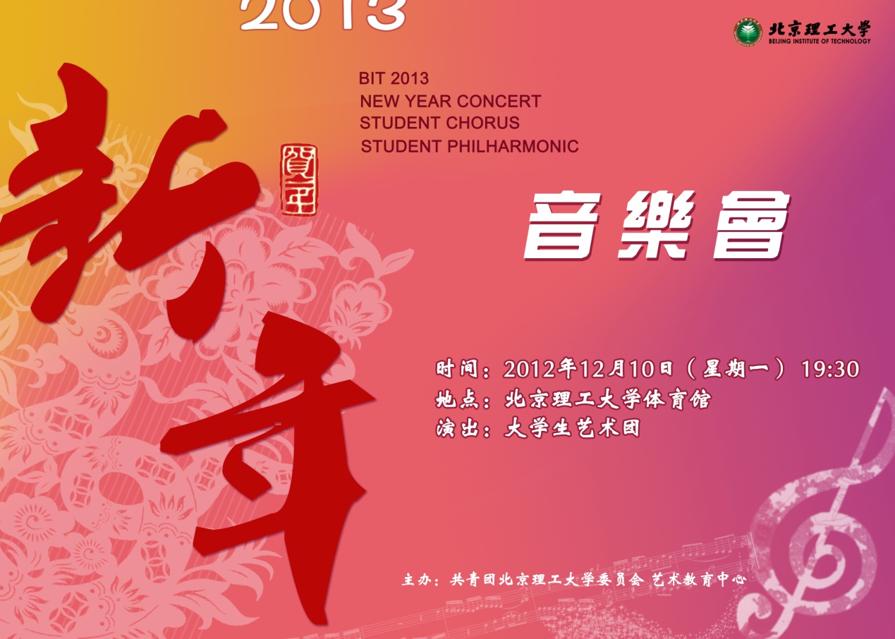 北京理工大學2013年新年音樂會將于2012年12月10日(星期一)19:30在中關村校區舉行。學校團委將聯系社區黨工委、學校工會、離退休工作處、后勤集團、留學生中心及各學院組織票務登記及發票事宜。敬請關注。