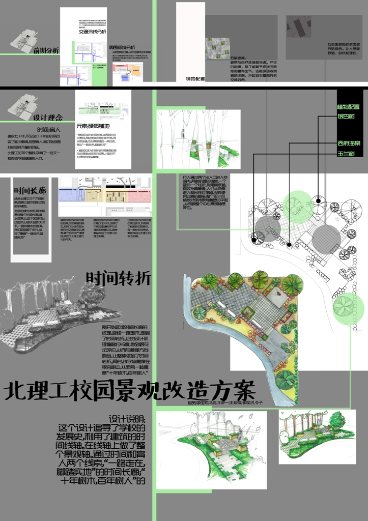 本次展出的方案,作者均為設計學院環境藝術設計系2010級本科生,在專業老師的指導下,學生們將校園景觀改造與城市公共空間景觀設計、植物景觀設計課程學習相結合。在大學生校園景觀需求調研、校園植物分析、錢學森像及周邊環境分析的基礎上,組成七個設計小組分別開展方案設計。所展出的五組方案,通過五個不同方向的設計嘗試——小廣場主題、植物群落主題、微地形主題、時間寓意主題以及思想迸發主題為立意展開錢學森像的遷移改造景觀設計,以求創造美好的校園景觀環境,對北京理工大學的校園景觀改造作出自己的貢獻。