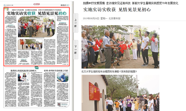 繼本報8月19日報道了《首都大學生扶貧:從新知到心知》之后,近日,北京青年報記者繼續對暑期首都大學生“七十年輝煌成就青年奮進行動”進行了采訪,繼“精準扶貧攻堅”的暑期實踐主題之后,本期聚焦一組“七十年輝煌成就青年奮進行動”的實踐主題,大學生們在實際走訪中切實感受了祖國發展變化,升華了愛國情懷。