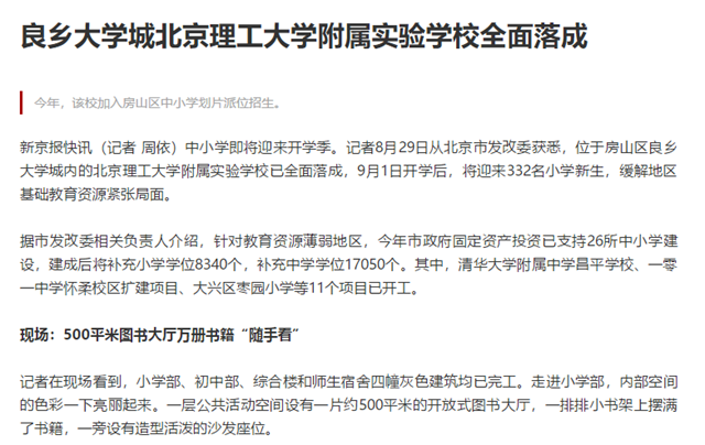 據(jù)了解,良鄉(xiāng)高教園區(qū)自2004年起,已陸續(xù)入駐北京理工大學(xué)、北京中醫(yī)藥大學(xué)等5所高校,在園高校師生人數(shù)約4.26萬人。此前,園區(qū)教職工及周邊小區(qū)居民的子女上學(xué),基本都在北京十二中朗悅學(xué)校等周邊中小學(xué),但近年來隨著學(xué)生增多,這些學(xué)校教學(xué)資源已趨于飽和,無法滿足需求。為此,市發(fā)改委支持建設(shè)了北京理工大學(xué)附屬實(shí)驗(yàn)學(xué)校,2018年北京理工大學(xué)和房山區(qū)政府簽署合作共建協(xié)議,今年學(xué)校全面落成,為良鄉(xiāng)大學(xué)城增加了一所優(yōu)質(zhì)基礎(chǔ)教育學(xué)校。