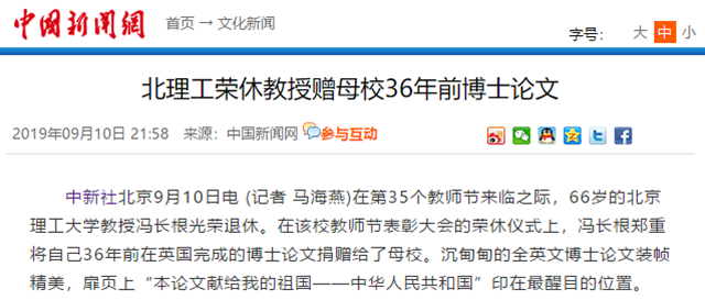 在第35個教師節(jié)來臨之際,66歲的北京理工大學(xué)教授馮長根光榮退休。在該校教師節(jié)表彰大會的榮休儀式上,馮長根鄭重將自己36年前在英國完成的博士論文捐贈給了母校。沉甸甸的全英文博士論文裝幀精美,扉頁上“本論文獻(xiàn)給我的祖國——中華人民共和國”印在最醒目的位置。