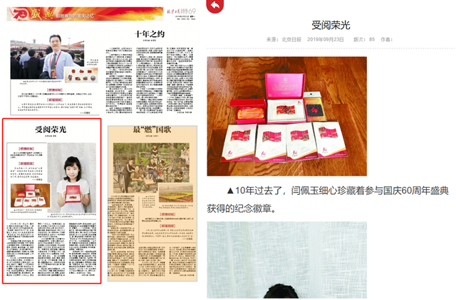 受閱結束,方隊一路向西走到西單,路兩側的群眾挨挨擠擠,手持國旗,歡呼著、雀躍著。回到學校,師生們拉起橫幅、夾道歡迎。“當時有一種光榮歸來的感覺,雖然大家表面很害羞,但心底都偷著樂,那種感覺,挺幸福。”閆佩玉說。如今,她仍細心珍藏著當年的紀念徽章和一些照片。“十年過去了,2009年10月1日仿佛成為了記憶中最長的一天,細節太多、故事動人,我很懷念它。”她說。