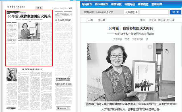 圖中的這位老奶奶叫和丕誥,她是陜西省工商聯一位退休干部。“60年前,我也曾參加過大閱兵,擔任國慶10周年慶典首都民兵師方陣的護旗手走過天安門,接受過毛主席和國家領導人的檢閱。可以說,我是屬于很幸運的人!”今年82歲的和丕誥前不久接受筆者采訪時這樣說。他手中的照片就是60年前參加國慶慶典時的情景,照片上有兩位女民兵,她們手握鋼槍,颯爽英姿,守護著國旗闊步向前。和丕誥老人不無自豪地指著照片上左邊那個女護旗手說:“這就是我。”
