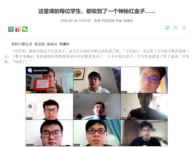 “同學(xué)們,我寄出的這個(gè)紅色盒子,這幾天大家應(yīng)該都已經(jīng)收到了吧。”2月24日,北京理工大學(xué)新學(xué)期開課第一天,《數(shù)字電路A》實(shí)驗(yàn)課的任課教師張延軍在屏幕前晃動(dòng)了一下手中的紅盒子。學(xué)生們也把盒子拿了起來(lái),回復(fù)道:“收到了!”