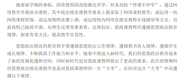 隨著新學期的來臨,因疫情原因高校推遲開學,但各高校“停課不停學”,通過網絡教學開展部分課程。其中政治理論課教學基本上都采取了網絡課程教學,或運用一些網絡課程資源,或運用教師直播上課,或運用校內網絡資源及教師在線輔導等方式。目前高校已陸續開課,從師生反饋效果來看,總體較好。思政課教師應遵循思想政治教育規律,探索有效方法,提高教學實效性。
