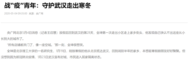 全坤是北京理工大學的一名研究生,1月19日,剛放寒假的他從北京抵達武漢,回到闊別半年的家鄉,本想趁寒假跟朋友好好聚聚。但沒想到因為新冠肺炎疫情,1月23日武漢宣布封城,市民進入居家隔離狀態。