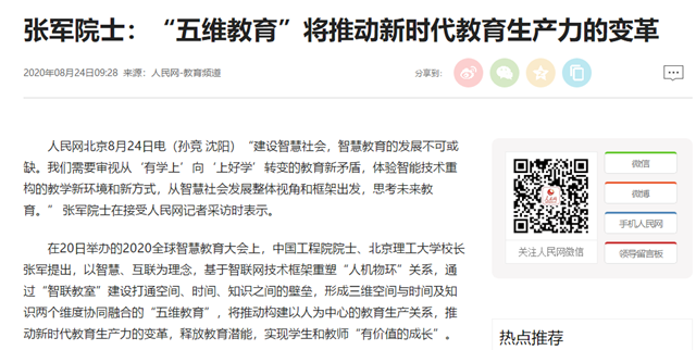 “建設智慧社會,智慧教育的發展不可或缺。我們需要審視從‘有學上’向‘上好學’轉變的教育新矛盾,體驗智能技術重構的教學新環境和新方式,從智慧社會發展整體視角和框架出發,思考未來教育。” 張軍院士在接受人民網記者采訪時表示。