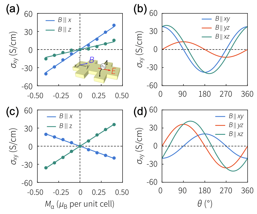 反常霍爾效應,磁性材料中最基本的輸運現象之一,不僅是諸多低功耗量子效應的物理原型,也是拓撲量子物態的重要基石。姚裕貴教授二十年來一直致力于該效應的研究,在該領域做出過開拓性的工作,比如率先發展了反常霍爾效應的第一性原理計算方法;定量研究了反常霍爾效應中基于貝里曲率的內稟機制,糾正了之前“外在機制占主導,內稟機制不重要”的普遍看法,顛覆了傳統認識并被獨立實驗證實[Phys. Rev. Lett. 92, 037204 (2004)];部分成果被寫進了M. P. Marder的流行教科書《Condensed Matter Physics》;推動了該領域的迅速發展。在通常的反常霍爾效應中,磁場/磁化、電場和霍爾電流相互垂直。近期理論研究發現,面內的磁化也可以導致反常霍爾效應,(稱為面內反常霍爾效應,IPAHE),然而以往IPAHE的研究主要關注具有非零磁化的鐵磁或者亞鐵磁系統。在應用上,凈磁化為零的反鐵磁系統相比鐵磁或亞鐵磁系統具有諸多優勢,如較強的抗磁場干擾、較快的自旋動力學、以及較高的堆積密度。那么,反鐵磁系統中是否也存在新奇的IPAHE值得深入研究。
