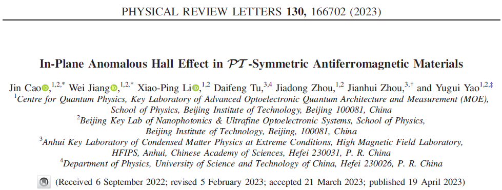 論文信息:Jin Cao, Wei Jiang, Xiao-Ping Li, Daifeng Tu, Jiadong Zhou, Jianhui Zhou, and Yugui Yao, "In-Plane Anomalous Hall Effect in PT-Symmetric Antiferromagnetic Materials", Phys. Rev. Lett. 130, 166702 (2023)