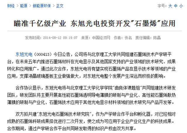 合作協(xié)議顯示,東旭光電將與北京理工大學(xué)化學(xué)學(xué)院"曲良體課題組"共同組建技術(shù)研發(fā)團(tuán)隊(duì),研發(fā)團(tuán)隊(duì)將主要開展高性能石墨烯透明導(dǎo)電薄膜的研制與產(chǎn)業(yè)化、高性能石墨烯散熱薄膜的研制與產(chǎn)業(yè)化、石墨烯技術(shù)應(yīng)用于其他光電顯示材料領(lǐng)域的技術(shù)研究與產(chǎn)品開發(fā)等。