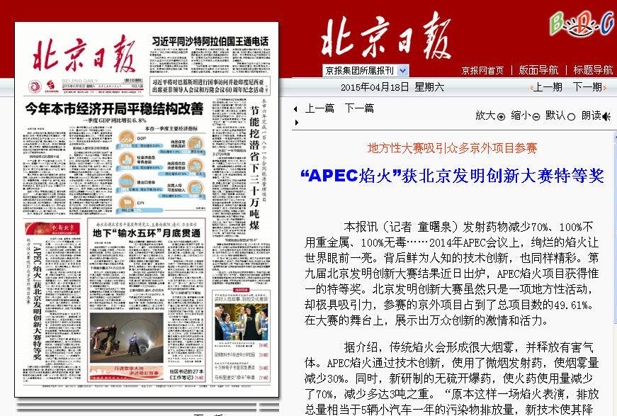 【北京日報】北理工“APEC焰火”獲北京發明創新大賽特等獎
